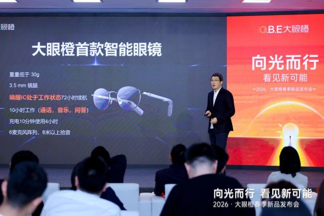 此外,本次发布会大眼橙首度跨界智能穿戴范畴,推出轻量化AI眼镜,标志着品牌从家庭投影向全场景智能显现终端的战略延伸。该产品整机分量低于30克,续航长达72小时,选用钛合金原料边框,内置6麦克风阵列,支撑远场拾音、智能语音帮手、实时同声传译及会议记录等功能,以科技美学统筹日常佩带与高效智能交互。